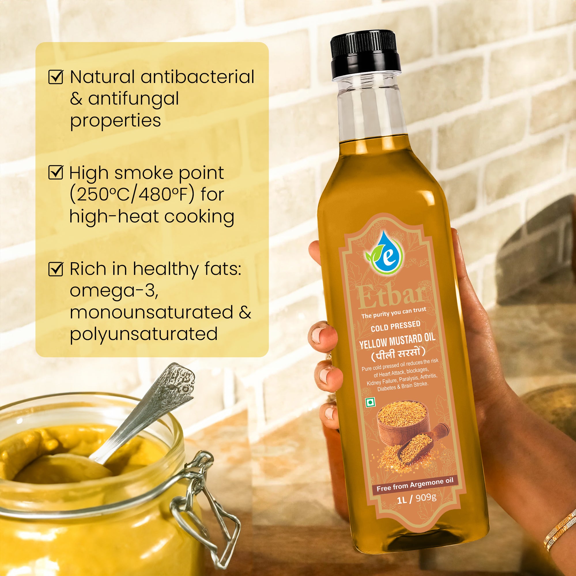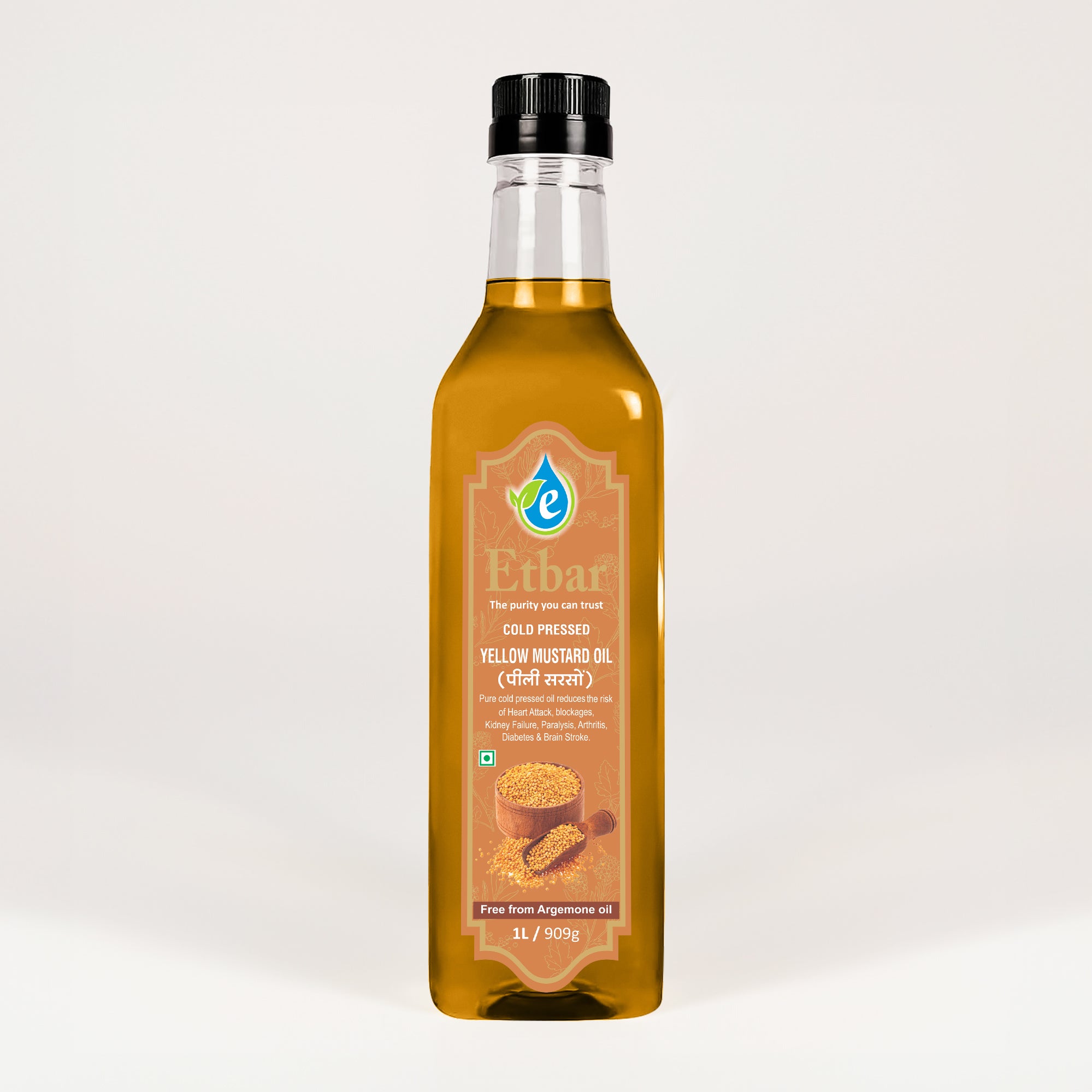 Crafted using the traditional Kolhu-pressing method, our yellow mustard oil is a testament to purity and quality. Sourced from the finest sun-dried seeds from our own unit, this oil retains its natural goodness and distinctive mild taste. Packed with nutrient-rich MUFA (Monounsaturated Fatty Acids) and immunity-boosting properties, Etbar Oils Yellow Mustard Oil is a product that guarantees excellence and promises to take care of your well-being.